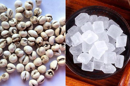 第二步:放一勺川贝进去,然后在川贝上撒5-10粒冰糖。