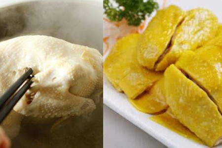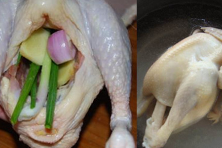 接着,煮上一锅沸水,把腌制好的鸡放入沸水中焯一遍水。让鸡的内脏进水,同时又提起鸡脖部位,倒出它肚中的水。如此反复,要做三次动作。重新加热制作好的汤水,把整只鸡放入锅中,一定要使鸡身整个浸没在汤汁中。大火煮沸后熄火,焖至十多分钟。如果鸡的体积比较大,那要多焖一会儿。