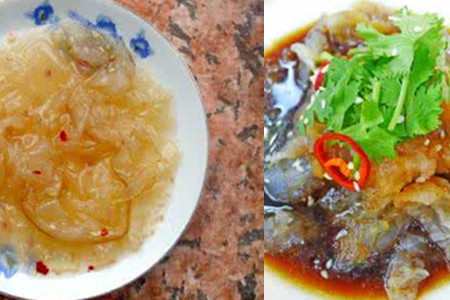 海蜇皮是海产品海蜇的制成品,海蜇是大型可食用的水母中的一种。在几千年前的晋朝就有人开始食用海蜇皮,在我国沿海地区均有分布,海蜇是我们渔业的重要经济来源之一。它具有清热降压、消肿化痰等功效,有高血压、哮喘的人士都可以多多食用些。不仅除此,海蜇皮吃起来也特别美味。在嘴里咀嚼劲道脆口,能发出脆声响。