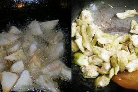 捞出来之后吧锅里面剩下的油倒出来,留下够炒菜用的油就可以。把油烧热之后在放上准备好的调料葱、姜、蒜这些炒几下出来香味之后在把茄子放到里面。这样翻炒几下之后就可以,倒入生抽。