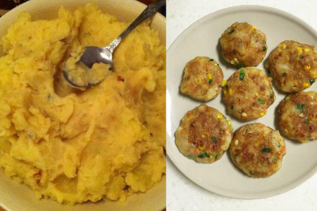 把蒸好的土豆拿出来后, 用勺子把土豆压成土豆泥,在里面加入适量的胡椒粉,盐和生粉,充分搅拌均匀。