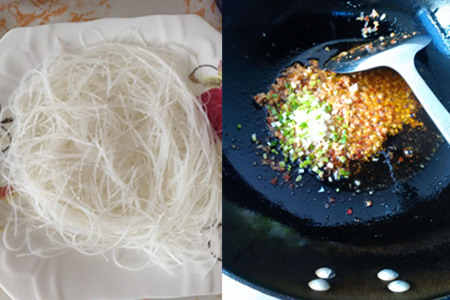 最后,加入之前备好的粉丝,添加适量的盐和生抽,继续翻炒两三分钟,待粉丝变软变黄,再出锅之前撒下一小把葱末。