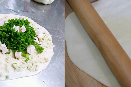 第二步:在圆饼表面刷上一层油,把盐、葱撒上去,从一边卷起,慢慢卷成花卷的样子,然后拍扁又从另一边重卷一次,然后擀成一个圆形。