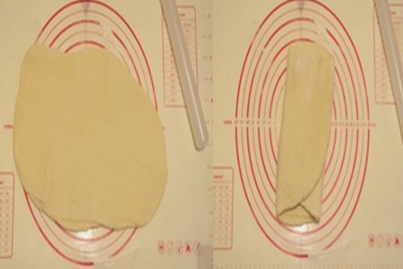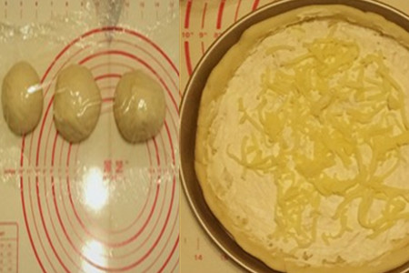 step5:取出面团,将其置于案板上,进行排气排气。然后根据食用的人数决定所擀的披萨盘的大小,特别需要注意的是,边缘需要略微厚一点点。