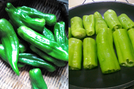 然后把青椒放进去,慢慢煸炒,火要关到最小,以免青椒表皮焦掉。煸炒至青椒整个变软,表皮带有一些小起泡了,就可以起锅了。整个过程可能需要10分钟左右,比较枯燥。