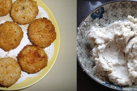 将调制好的面团做成饼状放入油锅中煎至双面成金黄色就好了。