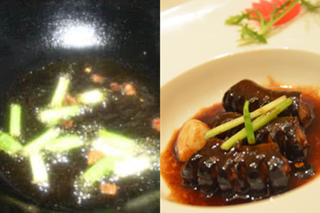 然后,在锅中放入适量的油,油温烧至七八成时,放入葱段。葱段炸至表面呈现金黄色时,捞出葱段。可以适当地盛出些葱油,防止太油腻。利用锅中的葱油爆香葱姜末,香味出来后加入海参丝,可以加入一些高汤。如果没有高汤,可以用清水代替。逐一加入盐、料酒、生抽和些许的白糖。