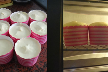 第三步:进行烤蛋糕。在蛋糕仅烤箱之前,应该将烤箱预热四五分钟;之后将一杯一杯的蛋糕放进烤箱,用150度的温度烤四十分钟左右就可以了。【女物原创未经允许,谢绝转载!】