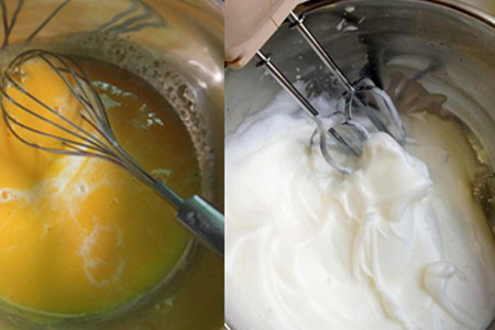 第二步:将鸡蛋的蛋白跟蛋黄分开,且分开放在不同的盆中,再分别加入适量的蛋糕粉、白砂糖、鲜牛奶和玉米油。先搅拌鸡蛋黄那盆,用来搅拌直到白砂糖融化;再打蛋白那盆,可以手动打也可以用电动搅拌器打,直到白色泡立起来且不再下去。再把打发好的蛋白慢慢倒入蛋黄盆中,搅拌均匀后装进一个个小纸杯中。