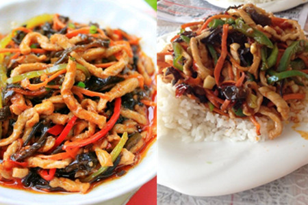 最后,将炒好的鱼香肉丝盖在米饭上就成功了。
