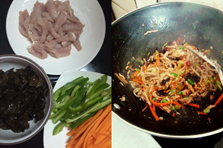 第三步,热锅倒入足量的油,烧开后首先将肉丝炒熟,盛出放在一旁备用。然后炒木耳、冬笋和胡萝卜,加入生姜碎均匀翻炒几分钟,再加入肉丝,放入适量的油,倒入刚刚调好的芡汁,大火翻炒几分钟。