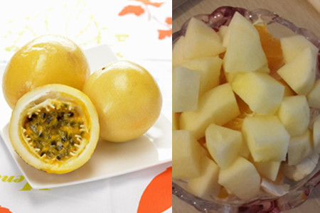 然后,我们再将切好的水果块和百香果一起倒入锅中。