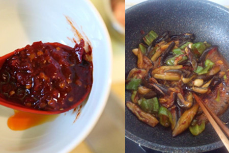 5.热锅放油,油在五分热的时候放入辣酱或者豆瓣酱,炒出红油(切记不要把辣酱炒糊),然后放入葱姜末炝锅,炒出香味后倒入茄条。翻炒3到4分钟后放入切好的青椒,再倒入鱼香酱汁翻炒片刻。出锅前再放入蒜末,一道鱼香茄子就做好了。【女物原创未经允许,谢绝转载!】