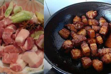 接着,在锅中倒入适量的油,放入五花肉块。再加入白砂糖,等五花肉煎至表面微黄的时候,逐一加入料酒、生抽。