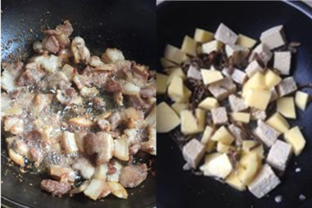 然后,在锅中加入去皮切成大小适当的块状。翻炒片刻,逐一加入冻豆腐块、水、盐、八角、生抽进行调味。