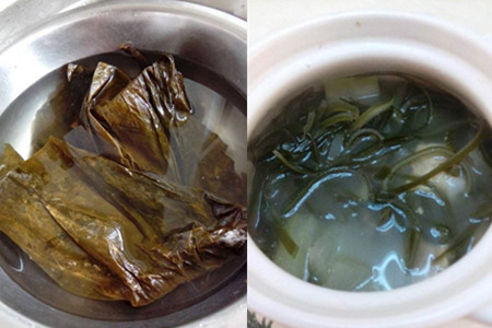 首先,将干海带在清水中泡发,如果用的是新鲜的海带,则要在清水中清洗去掉表面的盐。排骨切成小段,然后在热水中稍稍煮一会儿去腥。