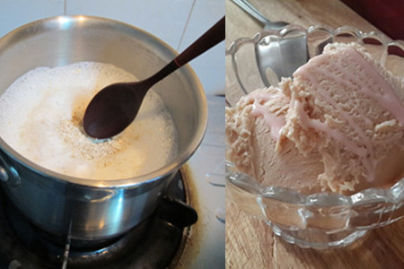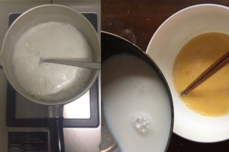 第二步就是处理牛奶。我们把牛奶加热,在锅中慢慢等它似开不开,上方有些烟飘出即可,停止加热。接下来就是用勺子一点一点将牛年加入到前面打好的鸡蛋中,一定不要图快一下全部加入,不然鸡蛋会直接被牛奶加热,导致鸡蛋熟了的惨剧,这样还吃什么冰淇淋呢?然后适当搅拌搅拌,让牛奶和鸡蛋混合完全即可,所以我们做冰淇淋其实不难,切忌心急。