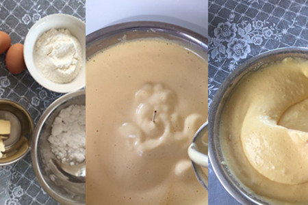 第三步:做蛋糕糊。将打发的蛋白取出四分之一与前面做出了的蛋黄糊混合搅拌均匀;再将低筋面粉筛进去(注意量),搅拌均匀;再将剩下的蛋白泡全部加入,继续搅拌均匀;将牛奶和黄油混合在一起热融在一起后,加入蛋糕糊中搅拌均匀。