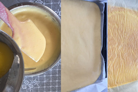 第四步:烤蛋糕。先将烤箱预热到180度左右,在烤盘底铺上一层烤纸,将蛋糕糊倒入烤盘放进烤箱在180度状态下烤制二十五分钟左右,等到蛋糕膨胀、颜色理想就可以取出来了。