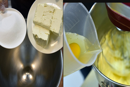 step3:接下来往搅拌器皿中加入定量的奶油芝士、糖,同样进行慢速搅拌直至均匀。