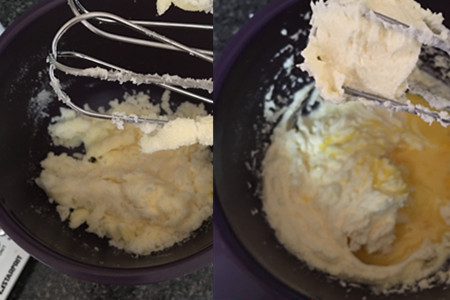 step2:加入打散的鸡蛋,加入鸡蛋时需要注意,不可一次全部加完,应分为三次加入。加入后同样选择打蛋器进行充分搅打,搅打的程度为使黄油和鸡蛋完全混合为一体才可再加入鸡蛋继续搅打。