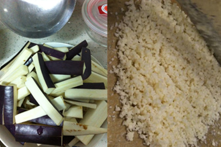 1.准备两个茄子,紫色茄子或者绿色的均可。然后准备两头蒜剥好(很喜欢吃蒜泥的也可以再多准备一头蒜)。准备小葱和生姜少许。料酒、盐、醬、醋等其他调配料准备好。