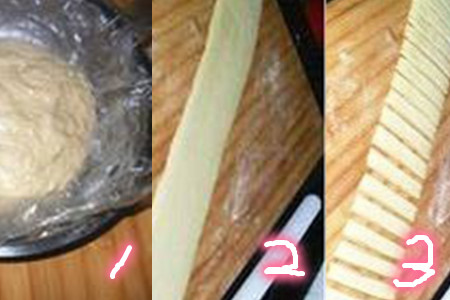 第四步:把切好的条两个两个放在一起,用筷子或者其他东西在中间压一压(这样可以将两根油条一起炸),之后就可以炸了。