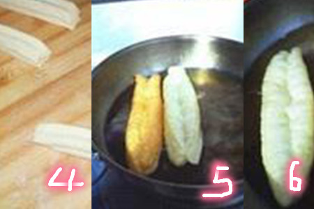 第五步:炸油条的油温要高,捏住面条的两头,捏紧一点,拉长,然后下到油锅里面去。