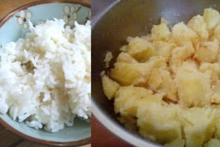 接着,在炒锅加入适当的油,加入切成小块的土豆翻炒片刻。加上适量的水煮上大概十分钟上下,淋上些十三香。等土豆煮熟后,用锅铲把它压成土豆泥就可以盛出备用了。另一些土豆切成土豆丝,或用专用的刷丝刀刷成丝状。用漏勺盛着,放在水龙头下冲洗去些淀粉,沥干水分。