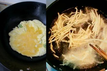 如果锅底有很多残余的东西,要先洗过。再在干净的锅中加油,放入切好的土豆丝炸至表面呈现金黄的色泽。