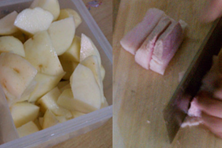 step2:对食材进行处理。你需要将洋葱切成薄片状,而将萝卜、马铃薯切成不规则的小厚块状。