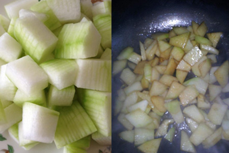 第一步,切下足够的冬瓜,洗掉冬瓜子,切成小块。