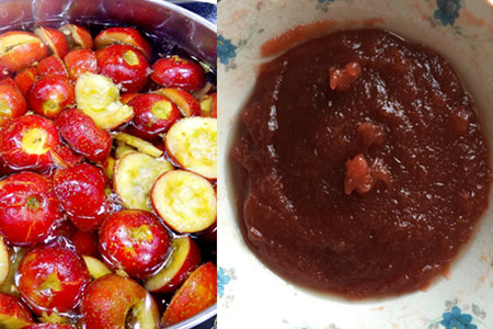 接下来,我们还需要用勺子或者是其他工具将锅中的果肉压烂。同时,我们还需要用筷子挑去锅中的果皮,因为果皮的存在会影响山楂糕的口感。