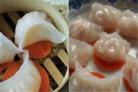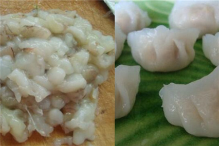 将准备好的馅包入虾饺皮中(一般一个水晶虾饺中包入两个大虾仁),这样水晶虾饺就完成了。