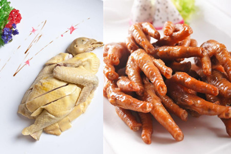 白切鸡,皮质爽滑,因其不加配料保持原味而味道清淡鲜美,肉质松软,在各种宴席上深得食客的喜爱。脆皮烧鹅,属于广式烧腊,最大的特定是肥而不腻,表皮酥脆。酱汁凤爪,广东人喜食凤爪,用各种配料酱汁腌制凤爪,先煮后炸再炖而成,实属人间佳肴。
