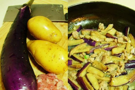 首先,准备一根茄子,两个土豆,还有少量的猪肉。将茄子切成一条一条的,土豆切成块状,猪肉切成丝状。