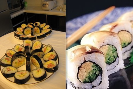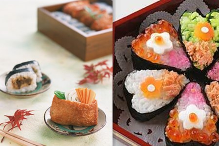 材料:大米、糯米、紫薯、黄瓜、胡萝卜、香肠、肉松、海苔、鸡蛋、寿司醋、沙拉酱、玉米淀粉。做法:将大米和糯米混合煮,将胡萝卜切成条状在沸水中小煮一会即可。将鸡蛋煎好切成条、黄瓜洗净切条。将紫薯煮熟和米饭一起加入寿司醋搅拌。取适量的米饭摊在海苔上,将鸡蛋、黄瓜、肉松、胡萝卜、火腿放上,再挤上沙拉酱卷起,用刀切小块就可以了。