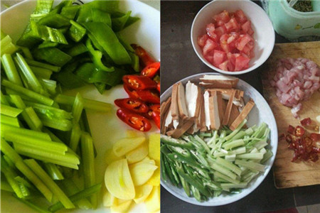 第一步还是事前将原材料,芹菜洗净并放置在阳光下晒干、香干若干块,洗净后切为条状备用、新鲜的五花肉或是其他同等级肉类均可切成丝状备用。如果想要在加一点佐料,蒜片、辣椒丁、葱丝、西红柿块其实都是不错的选择,将他们整理好备用。