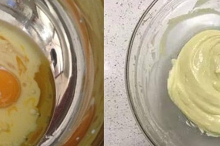 然后加入65克的低粉和纯牛奶搅匀。加入一个完整的鸡蛋,然后搅匀。搅匀之后再加入之前取出的四个蛋黄,再将它搅匀。四个蛋清加50克糖用打蛋器打发,舀出一勺放入之前打匀的蛋黄糊里,搅拌均匀以后倒入装有蛋白的盆中,再进行搅拌。