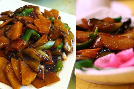 地三鲜:地三鲜是东北地区常见的餐桌美食,三鲜是指茄子、土豆、青椒,营养丰富、味道鲜浓、绿色健康。取一个茄子,两个土豆,三四个青椒,将茄子、土豆分别洗干净切成小块,青椒切段。