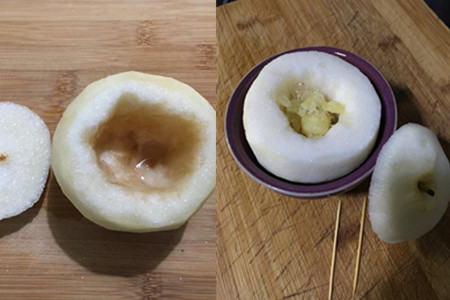 下面我们需要将雪梨从顶部切一刀,然后用勺子配合刀子将雪梨中的核去掉。接着,我们需要将川贝放到里面,同时再加入适量的冰糖。因为这种药材口味是比较苦的,加入冰糖可以缓解它的苦涩,这样在吃的时候味道也会更好。