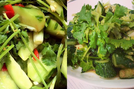 说到这个香菜,好处多到说不出来,用来做凉拌也是一流的。买回来的青瓜洗干净并保留皮,用刀背拍烂,然后切成一块块的放盘里面。香菜切碎后并加到青瓜里面。放2勺老干妈辣椒酱,少许芝麻油,醋少许,少许的盐巴。这些佐料全部加进去以后就把它搅拌均匀,待放置几分钟后等它入味后就可以吃。也可放入冰箱冷藏吃,味道一样的好。