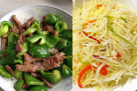 尖椒炒牛肉和酸辣土豆丝是川菜菜谱中最常见的小炒,做法简单、口感香醇浓厚、辣感十足。两道菜都是使用爆炒的烹饪手法需要大火快速翻炒,对火候的掌握十分重要。其中尖椒炒牛肉的口感偏向麻辣,酸辣土豆丝的口感则偏向酸辣,都是以辣作为基本,但辣的程度不同。现在我们就来分别教一教大家这两道菜肴的家常做法,一起来学习一下吧!