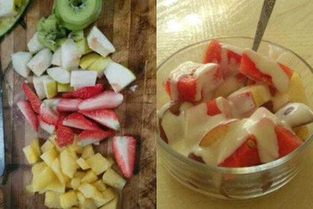 第三步:按照自己的口味加入适量的沙拉酱,充分搅拌之后,就可以食用了。不过,也可以用小碗装着沙拉酱,水果蘸着沙拉酱来吃,别有一番风味。