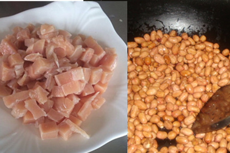 4.鸡胸肉先用刀背拍松,然后切成丁,然后加料酒、食言、淀粉、姜末腌制几分钟。然后热锅放油把鸡丁炒至8成熟后出锅装盘备用。