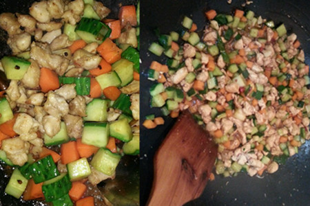 5.把调好的汁倒进锅里加豆瓣酱翻炒出香味,然后把胡萝卜和鸡丁再一起倒进锅里翻炒。