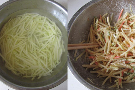 首先,准备两颗中等大小的土豆,削掉土豆皮,将其切成土豆丝,之后放在水中浸泡10分钟。将胡萝卜切丝,洗好和土豆丝放在一起。