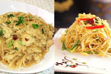然后,热锅倒入适量的油,先将鸡蛋炒到八成熟,捞起放在一旁备用。再向锅中倒入适量的油,放入花椒、蒜翻炒增香,然后倒入土豆丝,添加适量的生抽和醋,大火翻炒几分钟。