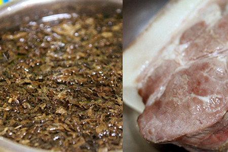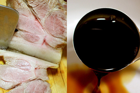 一、食材准备。猪臀尖半斤,梅干菜二十五克,调料油生抽、老抽、八角、糖、味精、料酒、葱。首先梅干菜提前一晚泡发,为去除梅干菜咸味,提前泡发多换几次水。猪肉焯水去除血沫,小火煮半小时备用。