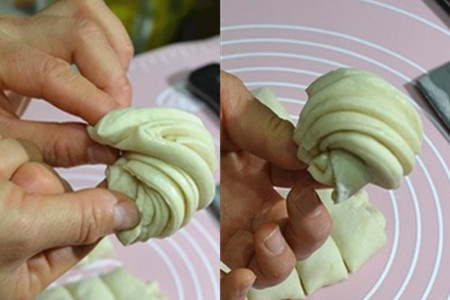 四、取两个小块叠起来,用筷子在中间压一个凹槽,双手分别捏住小块两头,相反方向旋转九十度,底部合并捏紧,花卷的整形就完成了。